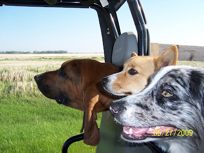 I'm late with blogging again! On Thursday, Duece & I were out by the trailer to play 'get up' again. Only this time we brought Duece's playmate, Ziva along. Ziva is almost fearless, which can be scary when we are near a road, but it's also handy when you're trying to show Duece he can run up the ramp and jump over the trailer railing. Ziva ran right up the ramp and over the railing and got the treats I was dropping on the trailer boards. I even picked Duece up and helped him over the railing but it took his watching Ziva get all those treats to finally get him to jump over the railing. It's another little step in our journey. The way Duece can jump, he should be able to skip the ramp and jump right up onto the trailer bed but even with Mattie, we had to start somewhere and the ramp worked great.